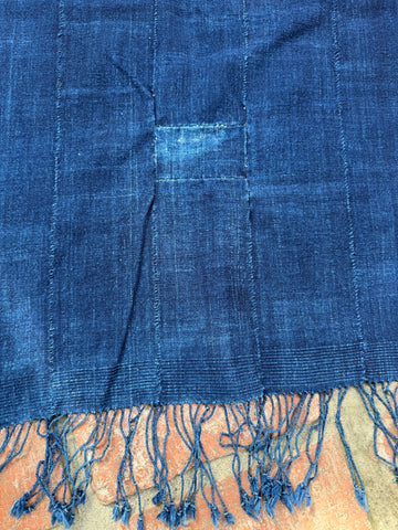 • Gorgeous thicker indigo piece with the most beautiful hand woven accent and long twist + knot fringe on each end. This Mossi textile is in very desirable vintage condition with one patch.
